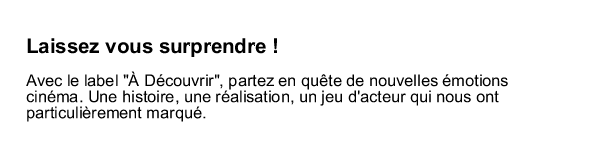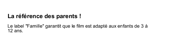 Les labels nous permettront de mettre en avant certains films que vous n’oseriez peut être pas aller voir. Ils seront également les garants de véritables moments d’émotions à Kinepolis. Enfin, pour les parents, ils sont une valeur sûre pour savoir si un film est adapté à leurs enfants ou non.